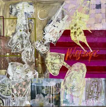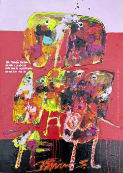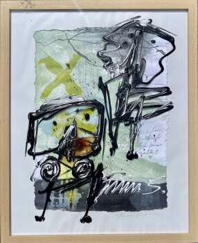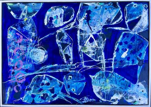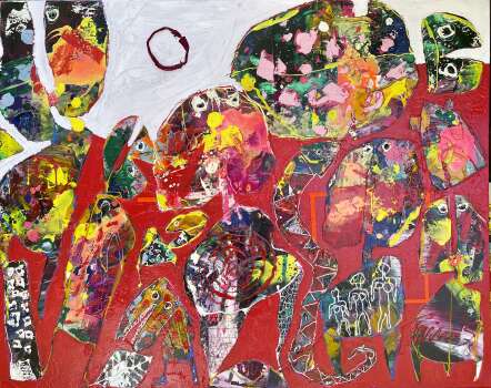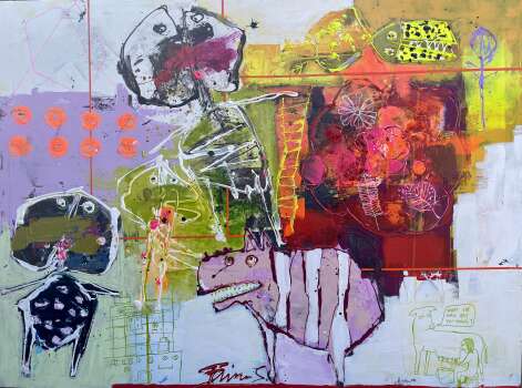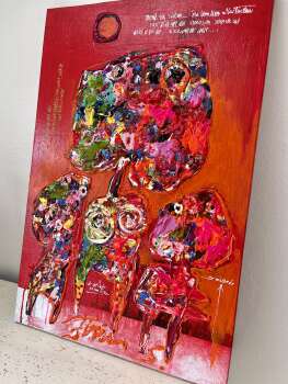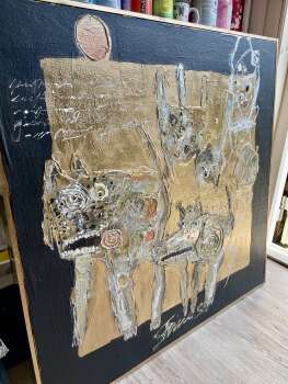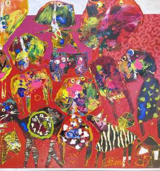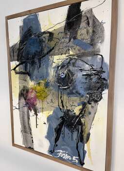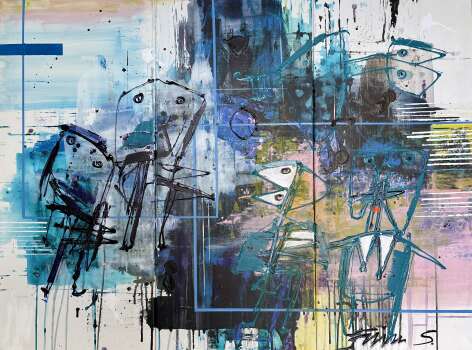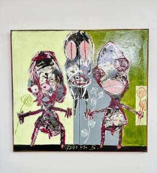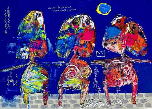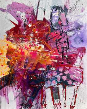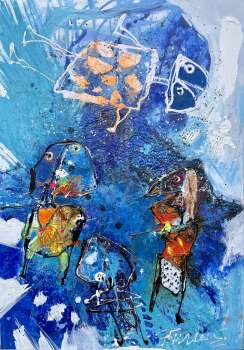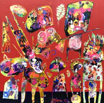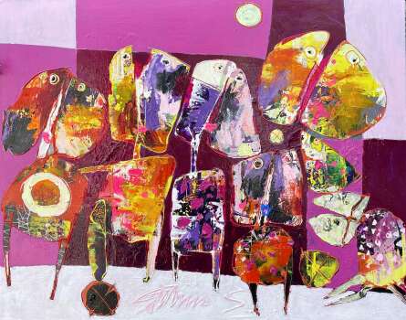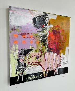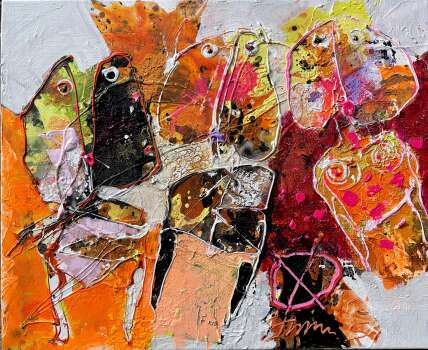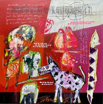... det var hvad jeg oplevede da jeg besøgte Kunstneren Finn Sørensen i hans galleri/atelier. Cobra-gruppen er Finns store inspirationskilde. Dog er der markant forskel, fordi jeg finder at Cobra-kunstnerne i deres kritiske og provokerende udtryk, ofte endte ud med værker der kan forekomme dystre. Sådan er Finns værker ikke, de er glade og livsbekræftende, og stråler af livsglæde, og jeg forstår derfor hans glæde over naive børnetegninger. Selv om inspirationen er umiskendelig, er det lige så klart at Finn har fundet sin helt egen udtryksform. Figurerne er helt hans egne, og når man ser dem forekommer det, at det er lykkedes Finn at få dem til at danse og til at kommunikere, både indbyrdes og med beskueren - det er en fantastisk oplevelse, og så det vidunderlige farvevalg, man kun kan blive glad over!